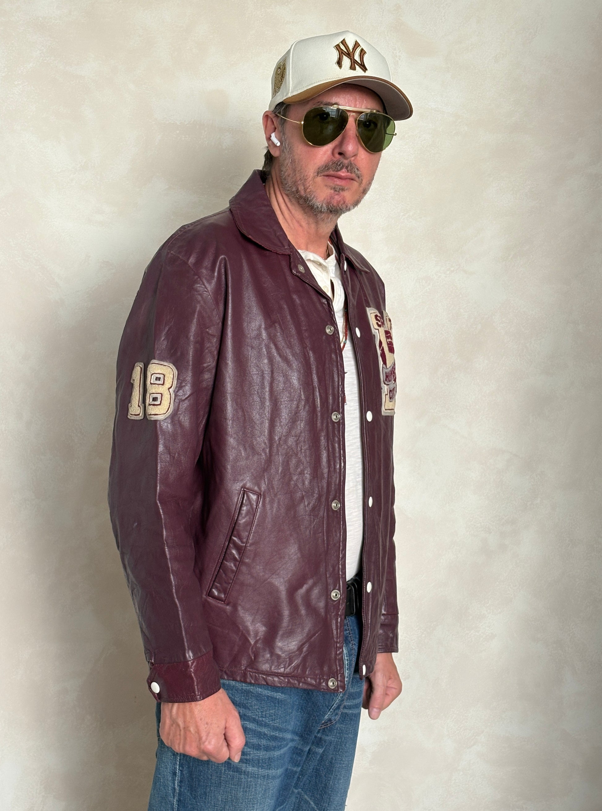 This burgundy leather bomber features classic chenille patches — “SR. 73,” “FLANKER,” and “City Champs” — representing the proud legacy of Humberside’s senior football team in Toronto.