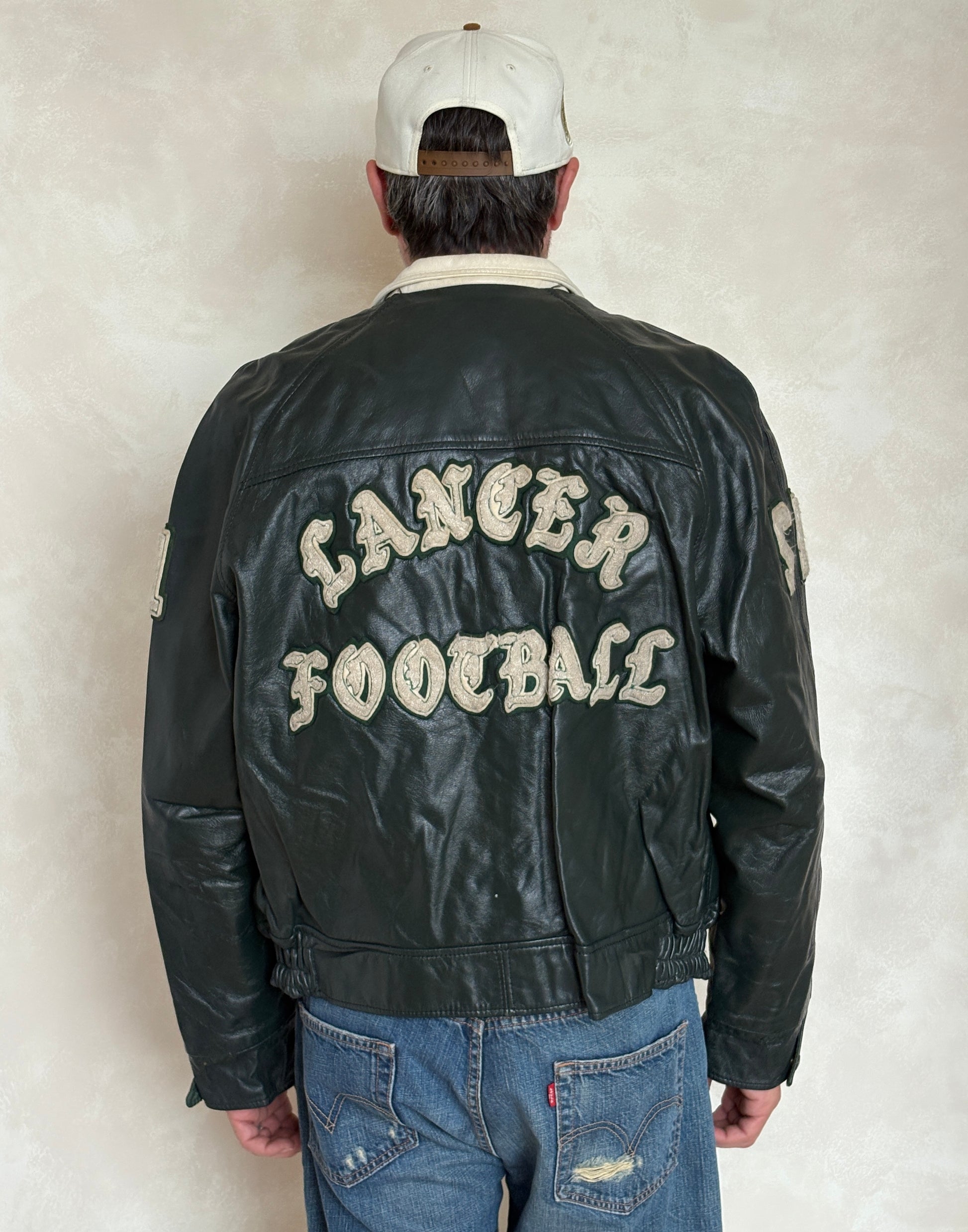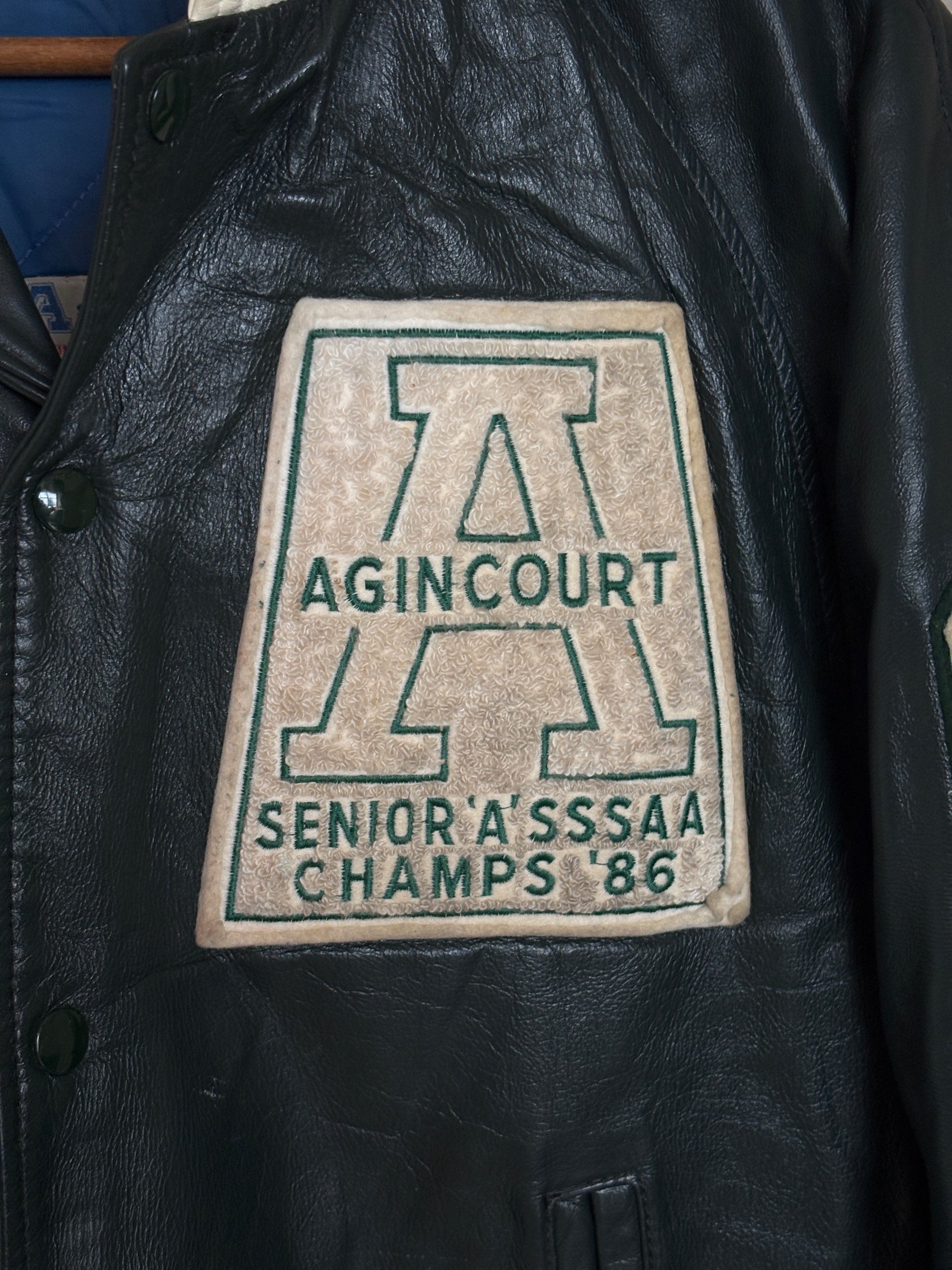 This dark green leather bomber features the bold chenille “A” Agincourt patch on the chest and large “Lancers Football” lettering across the back — symbols of pride for one of Toronto’s most competitive high school teams.