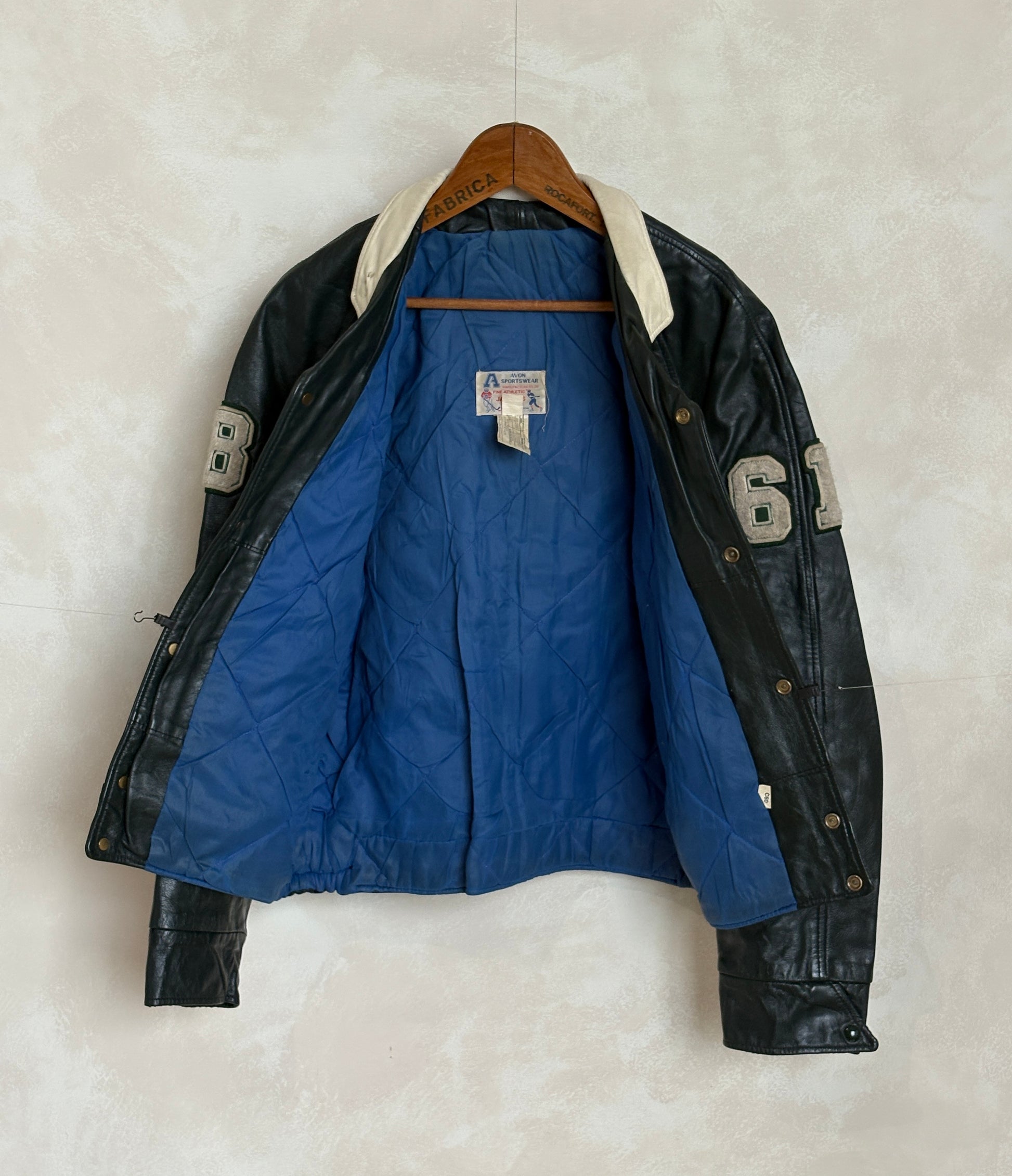 Crafted in Canada during the 1980s, this jacket captures the essence of classic North American varsity style: thick leather, quilted lining, and meticulously hand-stitched patches.